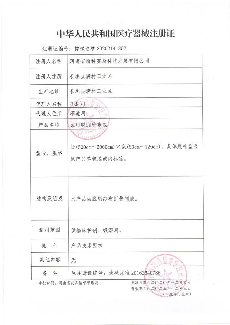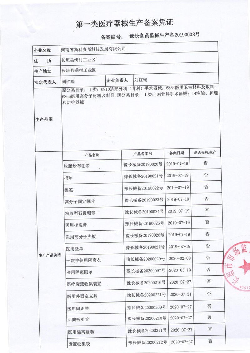 河南省斯科賽斯科技發(fā)展有限公司創(chuàng)建于 2011 年,位于“中國醫(yī)療耗材之都”- 河南省長垣縣,西臨 308 省道,南靠新菏鐵路,北依長濟高速,交通便捷,經(jīng)濟發(fā)達,環(huán)境優(yōu)美。斯科賽斯積極進入醫(yī)療健康和服務(wù)領(lǐng)域,秉承為用戶創(chuàng)造價值的理念,專注于醫(yī)用耗材解決方案的研發(fā)和運營,并為用戶提供完善的產(chǎn)品解決方案;  斯科賽斯主要生產(chǎn)醫(yī)用麻醉系列、醫(yī)用高分子系列、醫(yī)用敷料包系列、醫(yī)用無紡布系列、醫(yī)用防護系列、醫(yī)用脫脂棉系列、生物材料制品類等七大類、100 多個品種、400 多個規(guī)格的產(chǎn)品。公司占地面積約 30000 平方米,建筑面積20000 平方米,擁有 10 萬級的凈化車間總面積 10000 平方米。擁有國際先進水平的生產(chǎn)設(shè)備和檢測儀器,技術(shù)裝備精良,檢測手段完善,為醫(yī)療行業(yè)的不斷發(fā)展進步提供保障。公司順利通過 ISO9001、ISO13485 質(zhì)量管理體系認證?! ∷箍瀑愃箞猿盅邪l(fā)高科技新產(chǎn)品,力爭在醫(yī)療器械關(guān)鍵領(lǐng)域取得技術(shù)和研發(fā)的重大突破;立足國內(nèi)和國際兩個市場,逐步實現(xiàn)管理理念、經(jīng)營機制、人力資源、技術(shù)、產(chǎn)品、市場等全方位對接,提高企業(yè)的核心競爭力;過去的歲月里,斯科賽斯砥礪前行,誠信務(wù)實,銳意進取,不斷創(chuàng)新,用自己的睿智和辛勞,以富有責(zé)任感的使命,在探索中追求,在追求中超越,致力于成為值得信賴的醫(yī)療用品生產(chǎn)企業(yè)!在未來的日子里,斯科賽斯將一如既往豪情滿懷,信心百倍,攜手并肩,執(zhí)著追求,向更高的的目標(biāo)前進,鑄造新的輝煌!